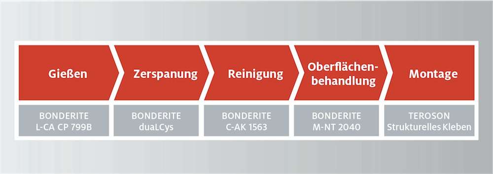 | Die Prozesslösungen von Henkel decken die gesamte Wertschöpfungskette vor, während und nach der Vorbehandlung von Einzel- und Multimetallsubstraten ab. |