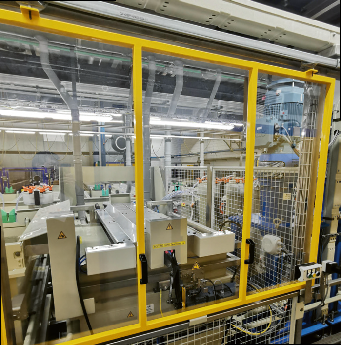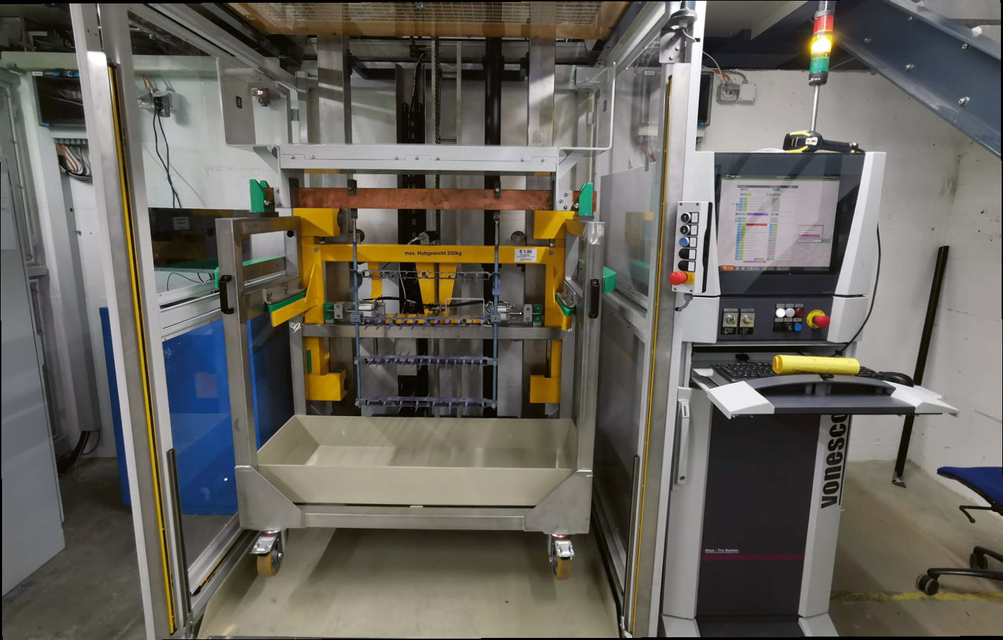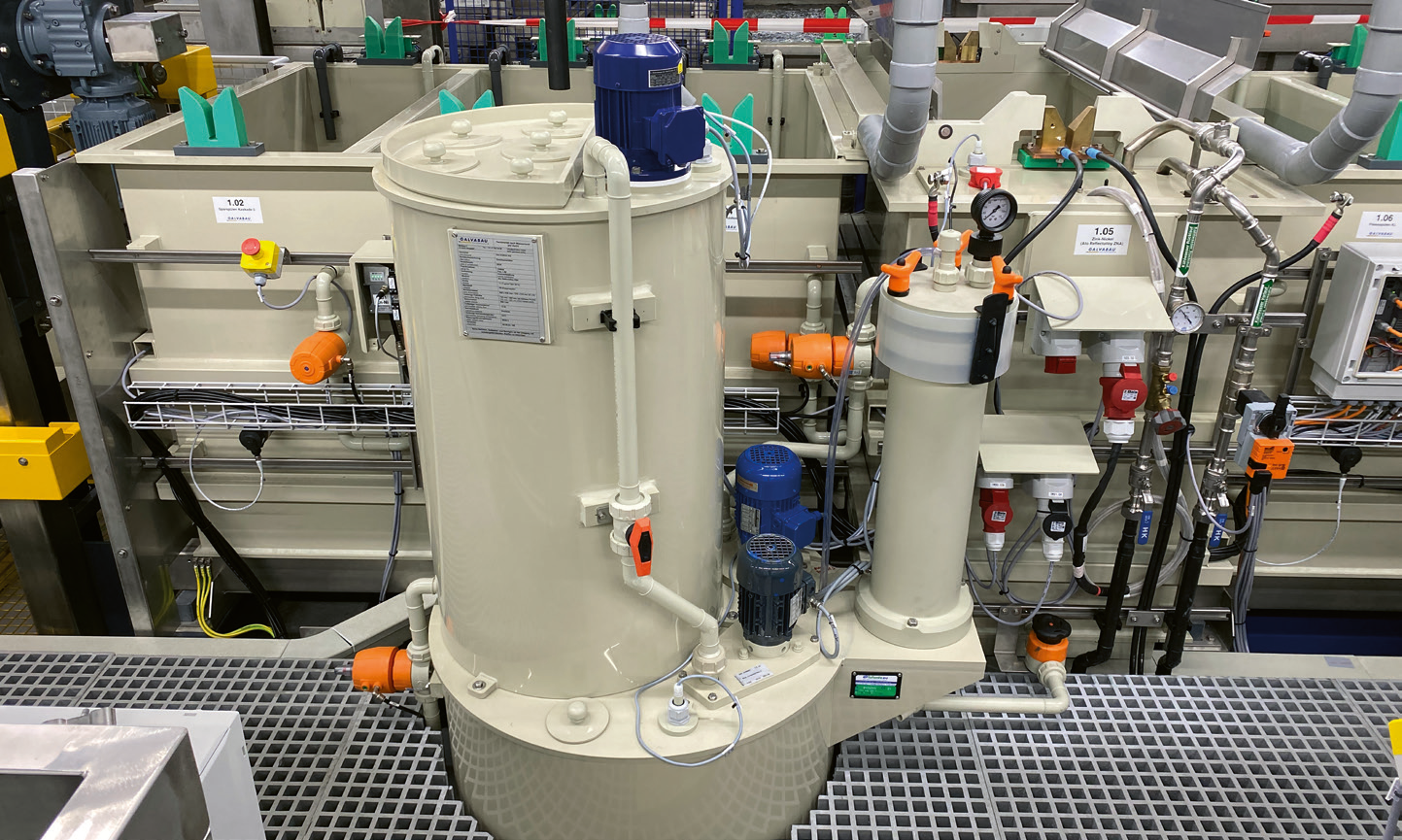 Aufgrund der benötigten, hohen Anzahl an Prozessbädern war es erforderlich, die Anlage oberhalb der Be- & Entladestation auf einem zusätzlichen Zwischenboden zu erweitern.