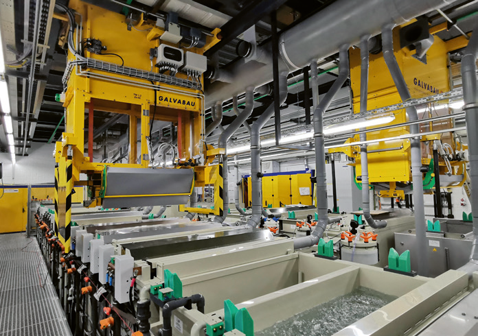 Die beiden neuen Anlagen wurden parallel zur bestehenden Anodisieranlage installiert. Die Be- & Entladung der Bauteile erfolgt im Erdgeschoss. Von dort werden die Warenträger in die Prozessebene gehoben und durch die einzelnen Prozessbäder geführt.