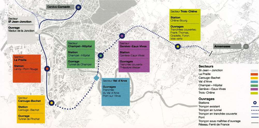 Côté suisse, la réalisation porte sur 14 km de lignes entre Genève Cornavin et la frontière, dont 8 km de liaison nouvelle entre La Praille et les Eaux-Vives. L’infrastructure consiste en une double voie électrifiée, principalement en souterrain, dotée de cinq nouvelles stations. Sept communes suisses sont concernées par le tracé du futur Léman Express.
