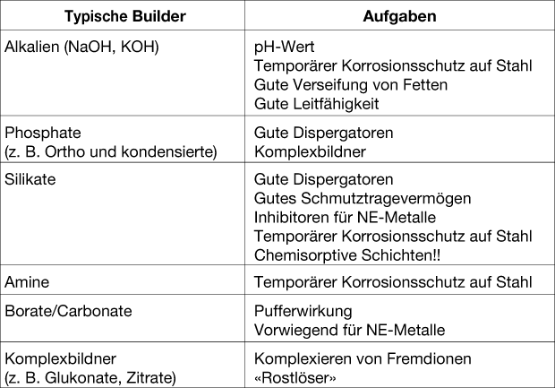 Auch die Inhaltsstoffe wässriger Reinigersysteme müssen näher betrachtet werden, da auch sie einen nicht unerheblichen Einfluss auf die nachfolgende Wärmebehandlung haben. Üblicherweise erfolgt die Einteilung in zwei Gruppen: Builder (Gerüststoffe) und Tenside.