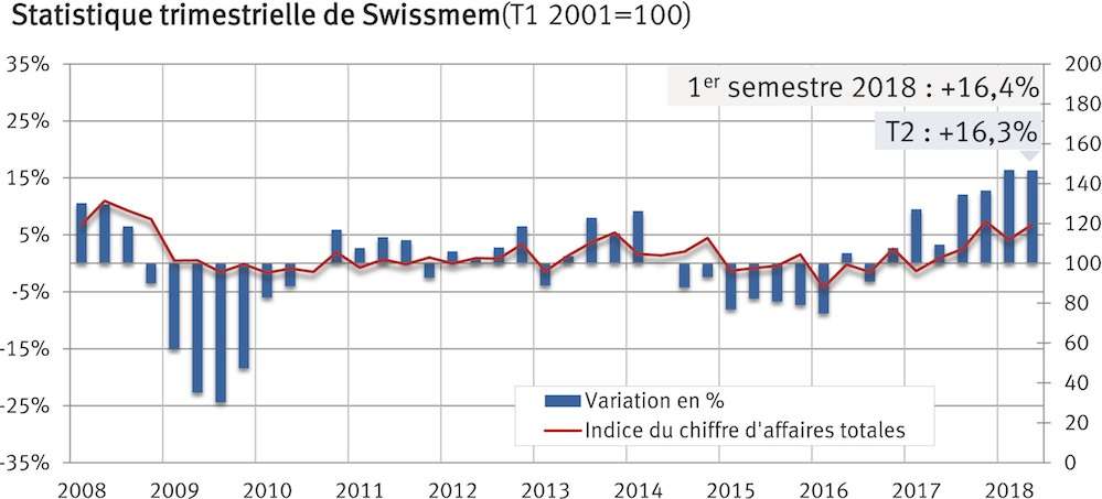 L’industrie suisse des machines, des équipements électriques et des métaux est en bonne voie. Durant le premier semestre 2018, les entrées de commandes ont augmenté de 24,1 % et le chiffre d’affaires de 16,4 % par rapport à la même période de l’année précédente. Les exportations de marchandises ont augmenté quant à elles de 7,5 % pour atteindre une valeur de 34,8 milliards de francs.