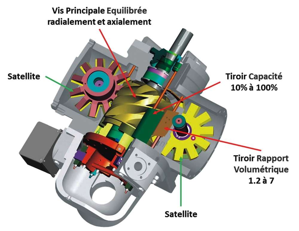 La clé du rendement élevé du compresseur à simple vis réside dans le système à tiroirs ParallexTM, qui permet au compresseur de fonctionner à un rendement optimal sur toute sa gamme de puissance. Les tiroirs de réglage du volume et du débit (avec un rapport volumétrique étendu de 1,2 à 7) se déplacent indépendamment l’un de l’autre, quelles que soient les conditions opératoires. Ils éliminent de la sorte tout surrégime ou sous-régime de compression et économisent la puissance du moteur.