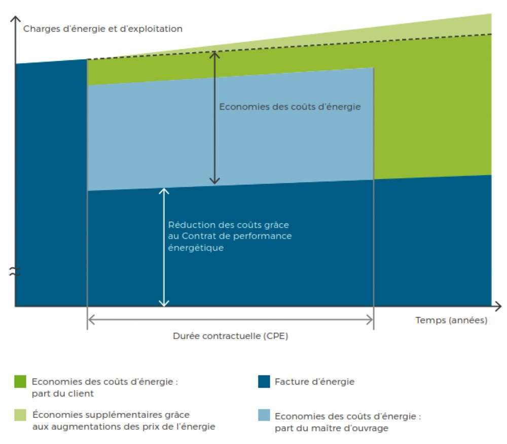 La figure 1 illustre l’exemple d’un CPE développé, financé et mis en œuvre par une ESCO. Dans ce cas, une part des économies d’énergie générées pendant la durée du contrat sera captée par l’ESCO pour amortir son investissement. Le client bénéficiera de la part restante, puis de l’intégralité des économies dès la fin du contrat.