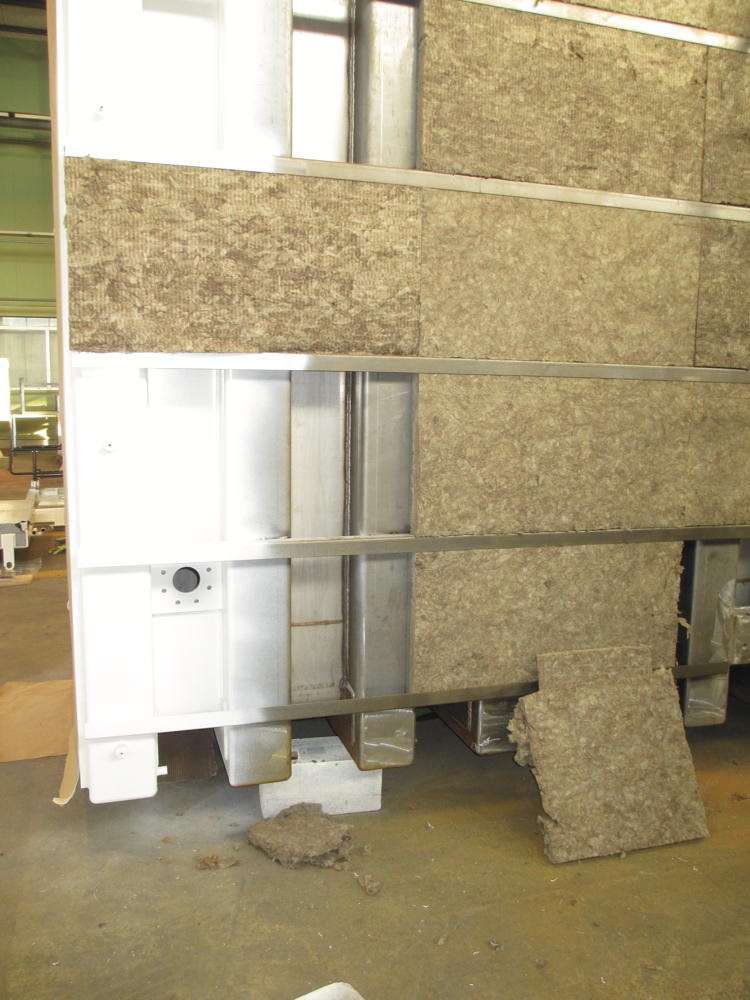 Le stérilisateur Vacuster est doté d’une isolation en laine de roche de 50 mm d’épaisseur. Il comporte à l’une de ses extrémités, une porte à ouverture verticale, à l’autre une porte à ouverture horizontale, une telle disposition ayant été requise par le client en raison de la place dont il dispose dans son atelier. La toiture, comportant une passerelle d’inspection munie d’un garde-fou, est équipée de puits destinés à accueillir les sondes de mesure, ainsi que des tubulures pour l’alimentation en oxyde d’éthylène, en azote et pour le vide. Un ventilateur assurera la distribution homogène de l’agent de stérilisation.