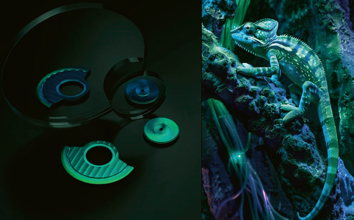 Une deuxième innovation de Positive Coating s’appelle MorphoColor : des revêtements dichroïques innovants, inspirés des couleurs changeantes du caméléon. Disponibles en Framboise Ambrée, Vert Céleste et Turquoise Violet, ces teintes évoluent selon la lumière, l’angle de vue et la finition (brossée, gravée, microbillée…). Une innovation où science et nature fusionnent : des couleurs vivantes, dynamiques, en perpétuelle transformation, pour sublimer chaque détail des pièces traitées.