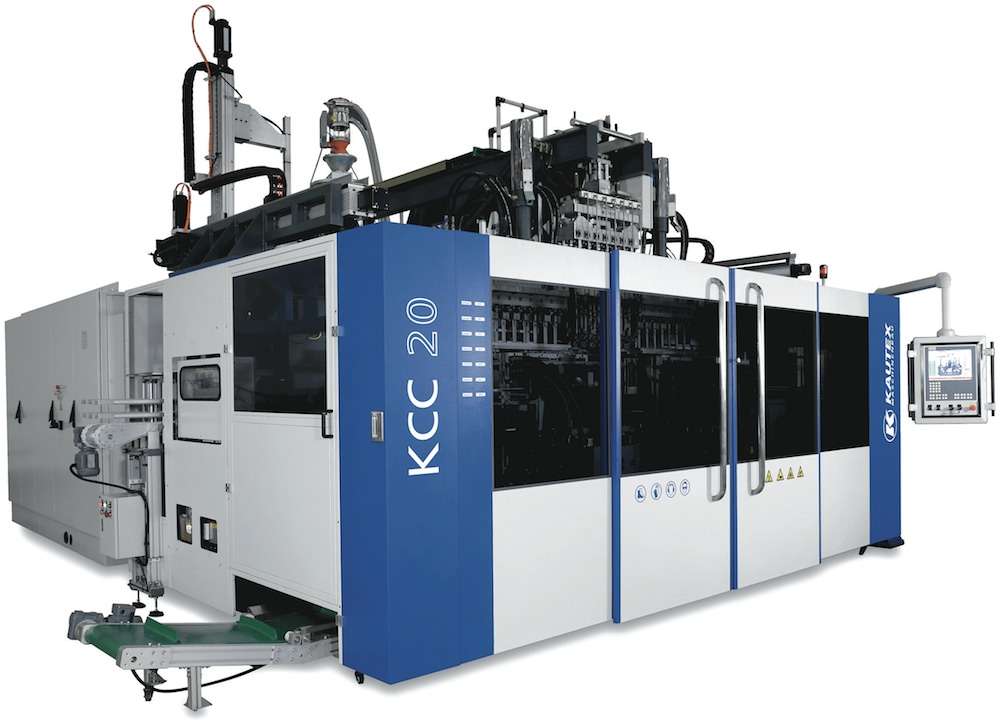 Les machines de la série KCC font partie des machines polyvalentes Kautex fabriquées sur le site de l’entreprise de Shunde. Ces machines sont notamment utilisées par les clients du secteur de l’emballage ou destinées à des applications spécifiques. Cette entreprise propose ses machines en versions à une station ou à double station. Ces dernières sont équipées d’une tête d’extrusion à plusieurs filières, qui introduisent la matière plastique chaude en alternance dans deux moules. Ces moules se déplacent vers les stations de soufflage de part et d’autre de la tête d’extrusion, qui insuffle l’air comprimé dans les corps creux. Deux autres stations sont destinées au prélèvement des produits finis. La tête d’extrusion, la station de soufflage et les moules comportent d’une à douze filières, ou cavités, en fonction de la taille et de la forme du produit souhaité.